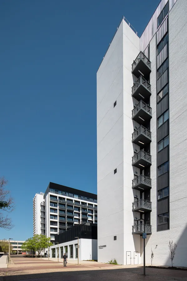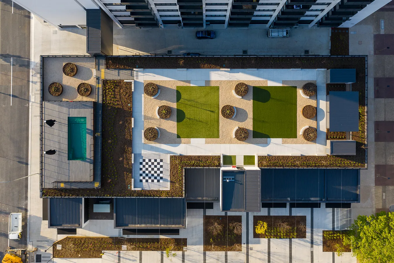 The smaller annexes have made way for a new retail and commercial thoroughfare set around a central and activated mews with the lower structures topped by beautifully conceived apartment amenities including a pool.